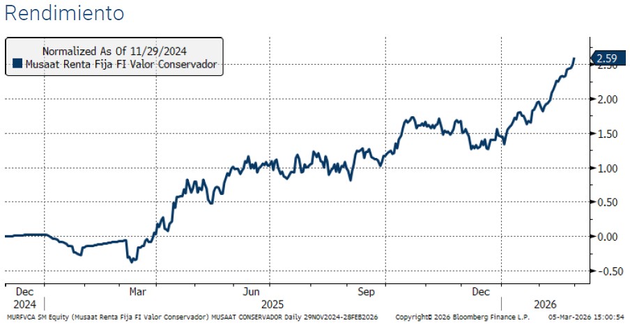 MUSAAT RENTA FIJA, FI / Valor Conservador es un fondo de renta fija pública, con al menos un 80% de exposición a renta fija pública. Los emisores serán principalmente de la zona euro, sin descartar otros países OCDE. El fondo puede invertir en otros fondos de renta fija pública. La calidad crediticia de los activos será, al menos, media (rating mínimo BBB-/Baa3 según cualquier agencia de rating regulada por ESMA), o si fuera inferior, el rating del Reino de España, en cada momento. La duración media de la cartera será inferior a 7 años. El fondo no tiene exposición a riesgo de divisa. Se podrá invertir hasta un 10% en activos que impliquen un mayor riesgo.